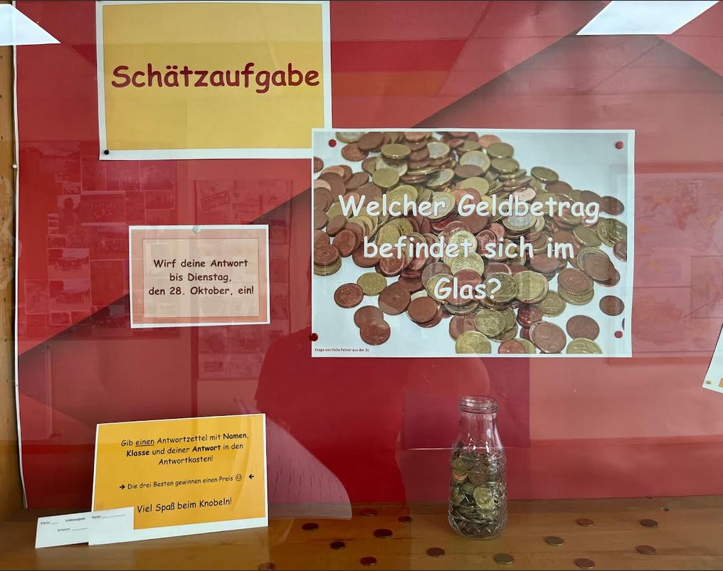 Die 1. Schätzfrage in diesem Schuljahr lautet: “ Welcher Geldbetrag befindet sich im Glas?“ von Felix Feiner aus der 2c Klasse.